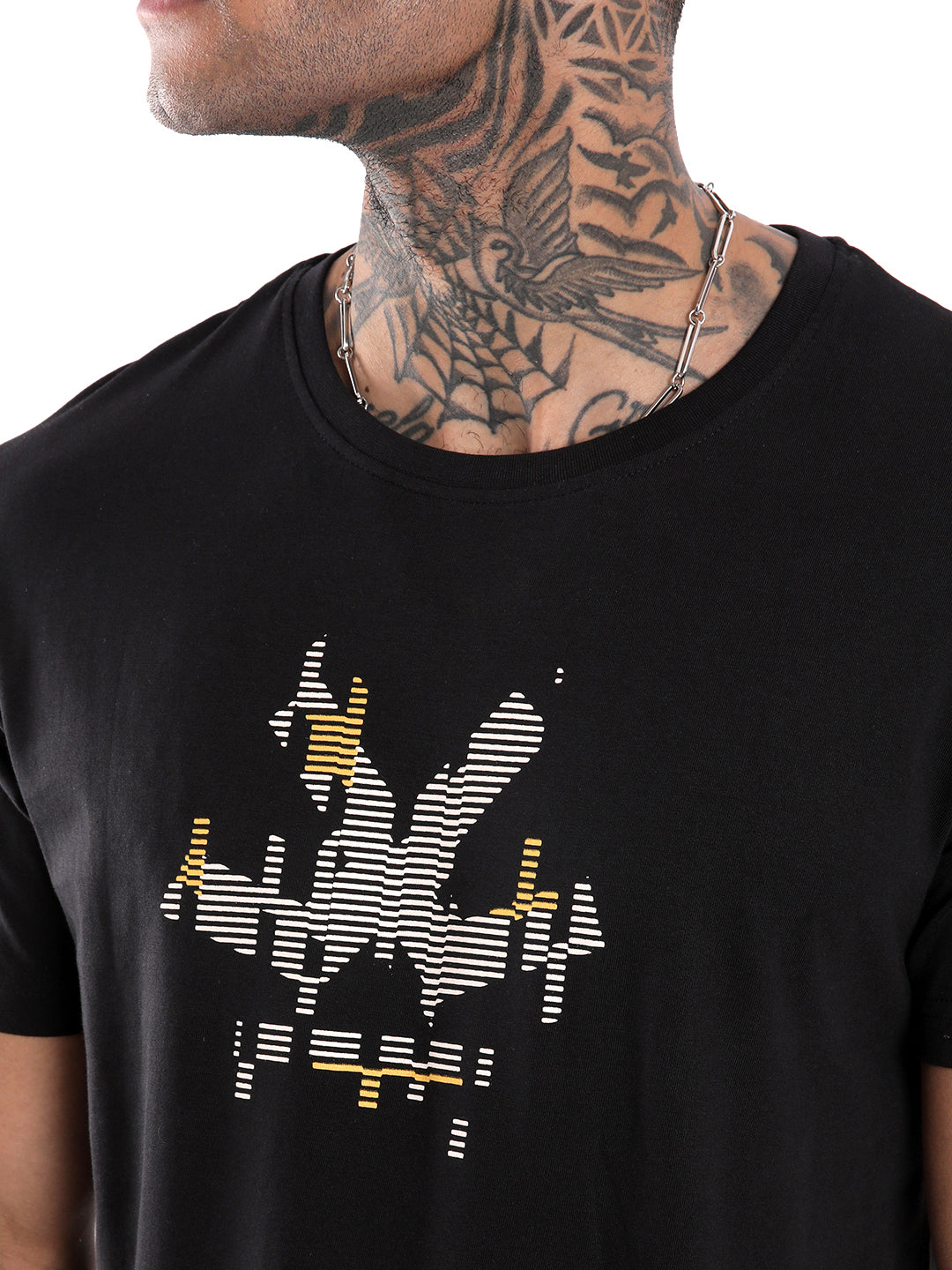 Black t-shirt with a glitched logo print, providing a modern and edgy design. Ideal for adding a statement piece to your casual collection.